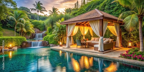 Luxurious poolside cabana at a tropical resort with lush landscaping, waterfalls