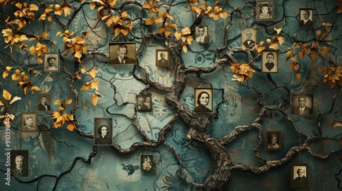 generations connected woman honoring ancestors with family tree of old photographs ai generated illustration