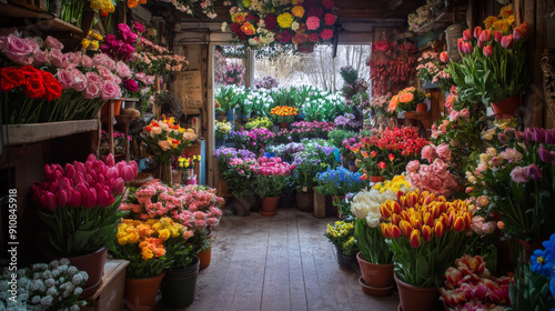 A flower shop in Valmiera, Latvia, is filled with colorful flowers like tulips and roses, as well as potted plants.