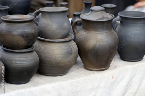 Products made of red clay. Pottery of different sizes exhibited
