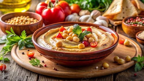 Hummus casero servido en un cuenco de cerámica, acompañado de garbanzos y especias frescas. Los colores vibrantes de los tomates y las hierbas resaltan, proporcionando una explosión de sabores mediter