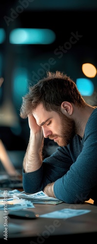 A clear image of a dejected person sitting at a desk with overdue bills, with a blurred background of a cluttered office space, highlighting the impact of economic downturns