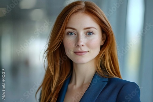 A confident young woman with long red hair, smiling softly in a modern indoor setting, embodying professionalism and approachability.