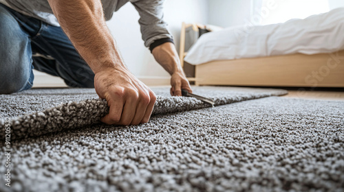 close-up of a professional installing new carpet in a cozy bedroom, home rug renovation