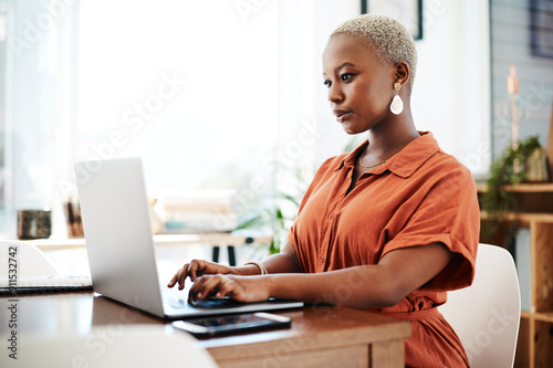 Typing, online and black woman with laptop, serious and thinking of ideas in office and copywriting. Writer, working and creative for website on desk, reading and confident in company and person
