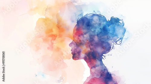 Silhouette of a young woman with colorful watercolor splashes creating an abstract and dreamy background.
