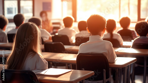 Schoolchildren sitting at desks, attentively listening to their teacher
