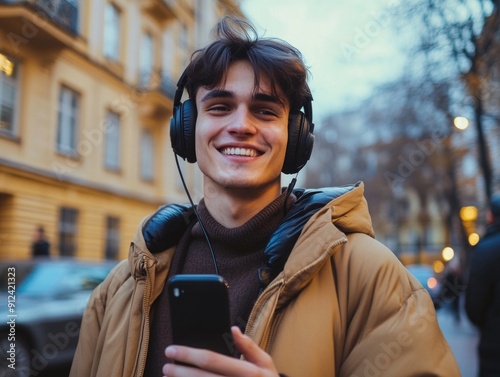 A young man enjoying his favorite tunes on the go, perfect for use in scenes about technology, entertainment, or everyday life