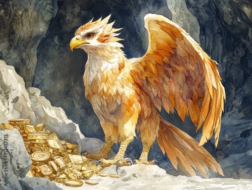 A majestic griffin a mythical creature with the body tail and back legs of a lion and the head wings and front talons of an eagle stands guard over a treasure hoard in a cavernous