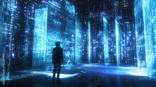 A lone figure stands in a futuristic city of glowing blue skyscrapers