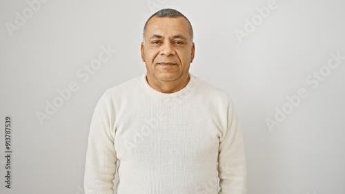 Mature hispanic man in a white sweater posing against an isolated white background, exuding confidence and approachability.
