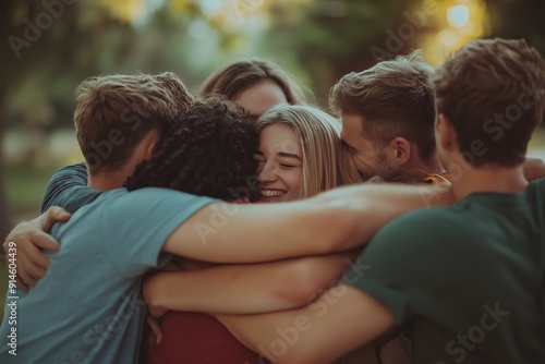 Friends Sharing a Warm Embrace in a Sunlit Park During Late Afternoon Gathering