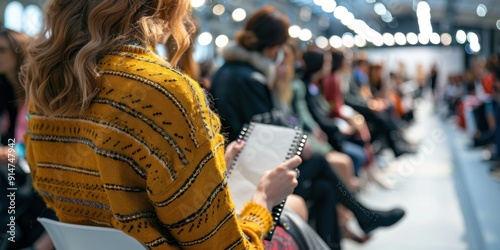 Woman in yellow sweater taking notes at a conference.