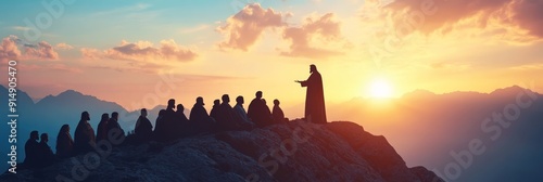 Silhouette of jesus preaching sermon on mountain top in ministry biblical gospel teaching