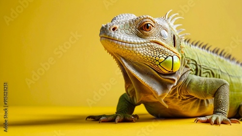 Green iguana isolated on yellow background. Banner with copy space. Close up, front side view. National Iguana Awareness Day