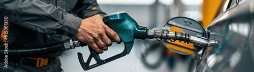 Close-up of a person fueling a car at a gas station, highlighting the process of refilling the vehicle with gasoline.