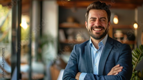 #1307536312Portrait of a handsome smiling businessman boss standing in his modern business company office.