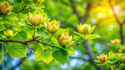 Branch of a tuliptree with vibrant green leaves, tuliptree, tulipwood, fiddletree, branch, leaves, nature, tree, forest, green