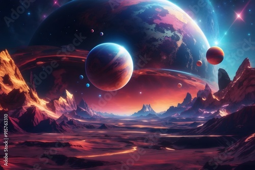 Futuristic fantasy landscape, sci-fi landscape with planet, neon light, cold planet. Galaxy, unknown planet. Dark natural scene with light reflection in water. Neon space galaxy portal. 3d