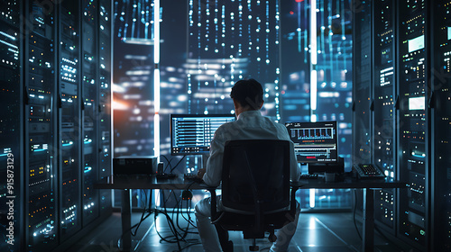 A male IT worker sits at his desk in front of computer monitors and looking computer screen, seen from behind and looking over the of an AI system that processes data on monitor displaying code