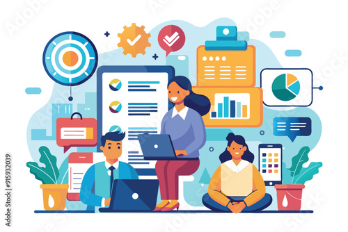 A diverse team collaborates with digital tools, analyzing data and discussing strategies to enhance consulting services and client outcomes
