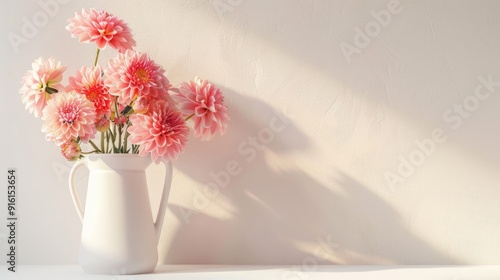 Coral pink dahlias in a jug on a white shelf against a neutral wall