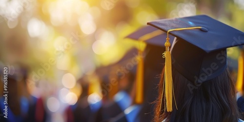 A beautiful Graduation Ceremony at sunset with students donning caps and gowns, celebrating academic achievements and milestones. A joyous event filled with pride, reflections, and new beginnings