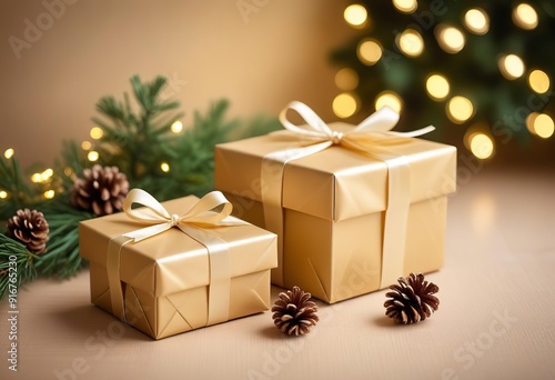 Christmas gifts wrapped in gold paper with satin bows are beautifully arranged among pine branches and cones. Ai generated