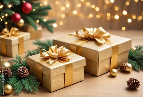 #954462719Christmas gifts wrapped in gold paper with satin bows are beautifully arranged among pine branches and cones. Ai generated