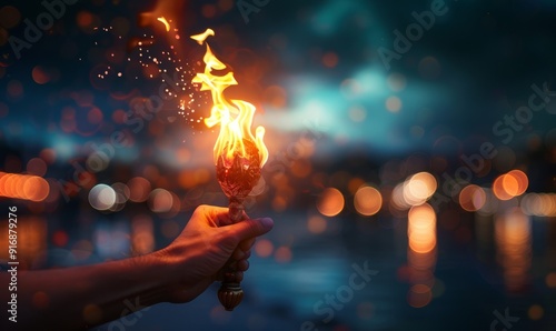 Hand holding a burning torch with abstract fire particles against a blurred cityscape at night, symbolizing power, energy, and illumination