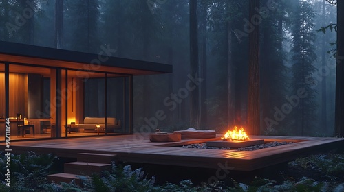 midcentury modern small office with modern floating deck with roaring firepit, surrounded by 200ft doug fir trees, nite sky, modern firepit, midcentury modern, single point perspective, minimalism,