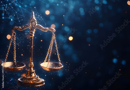 High-tech blue Digital justice scale surrounded by digital data on blue bokeh background, representing the role of AI in business justice design