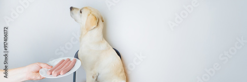 A Labrador retriever refuses a plate of sausages, highlighting pet food preferences and dietary concerns