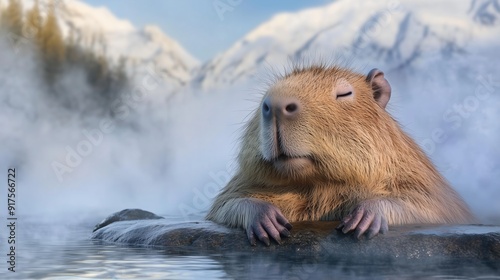 A capybara relaxes in a hot spring, eyes closed in contentment, with a serene mountain landscape in the background