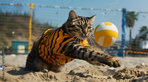 Tabby Cat Playing Beach Volleyball in Striped Shirt on Sandy Beach