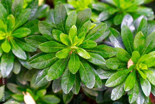Close-up of Euphorbia Amygdaloides plant at botanical garden at Italian City of Meran on a sunny summer day. Photo taken July 16th, 2024, Merano Meran, Italy.