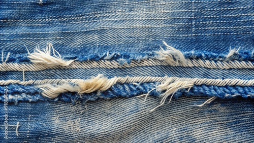 Distressed denim fabric with a unique abstract pattern of faded blue and white threads, creases, and frayed edges, showcasing a vintage, worn look.