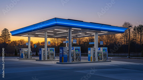 A modern gas station during the evening. The station has a blue and white canopy, with multiple fuel pumps underneath. The pumps are illuminated by bright lights, and there are a few signs and banners