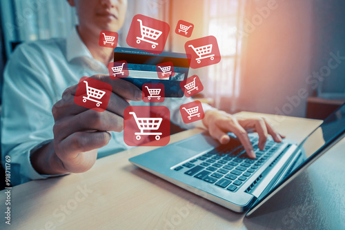 Elegant customer hold credit card with hologram interface choose online platform. Smart consumer typing laptop while open e-commerce application use cashless technology shopping inventory. Cybercash.