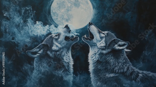 A pair of wolves howling under a full moon with their breath visible in the cold night, symbolizing primal instinct and the wild spirit
