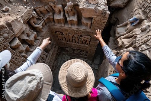 A group of tourists examines detailed hieroglyphics on ancient ruins, pointing out specific characters and observing the intricate carvings and historical significance.