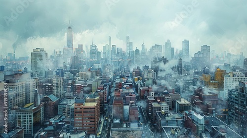 Panoramic view of a bustling city skyline covered in fog and smog, highlighting urban density and environmental issues.