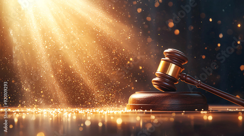 A wooden gavel sits on a wooden podium with a light shining on it. The gavel is surrounded by a lot of glitter, giving the image a sense of importance and grandeur.