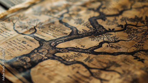 Close-up of a genealogy chart printed on canvas, showing a family tree with ancestors dating back centuries
