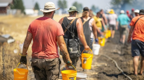A group of volunteers walking in a line with buckets in a muddy field, depicting a strong sense of community, cooperation, and environmental or disaster recovery efforts.