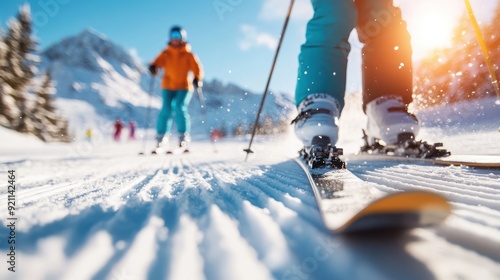 Two skiers in colorful outfits are viewed from behind as they ski on a snow-covered track, surrounded by snow-laden trees and majestic mountains under the bright winter sky.