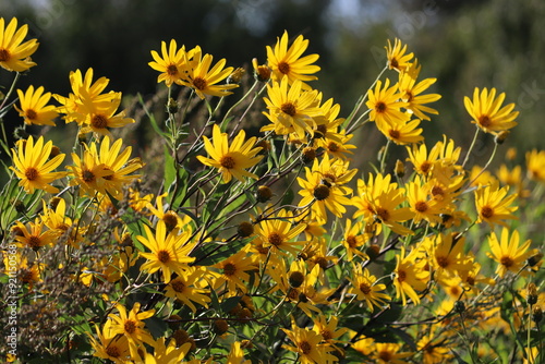 Yellow flowers of Jerusalem artichoke plant or Helianthus tuberosus in summer garden