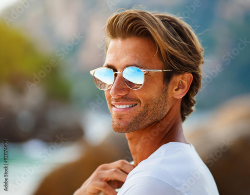 Opalony przystojny mężczyzna w okularach przeciwsłonecznych na wakacjach