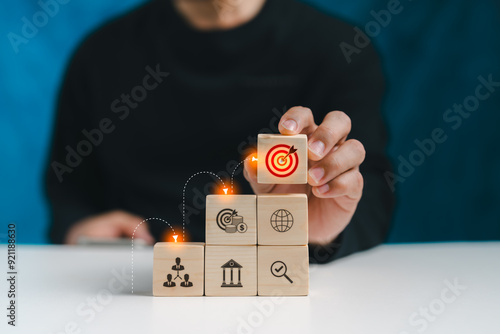 focusing on the company idea and utilizing a business strategy and action plan while manually stacking wood blocks.concept for expanding a firm.