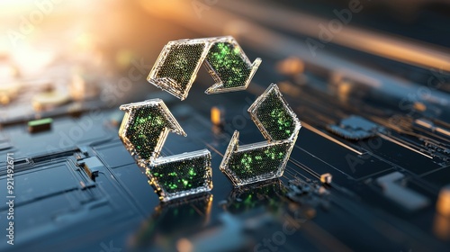 A close-up of a 3D recycling symbol made of green metallic material, showing intricate textures and reflections. The symbol is illuminated by soft, ambient lighting, enhancing its details and